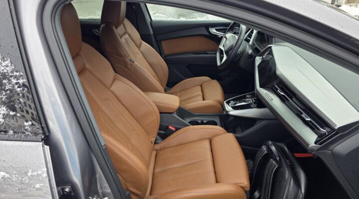 Audi Q4 E-tron 40 Advanced – Luxusní interiér v hnědé kůži a praktické tažné zařízení